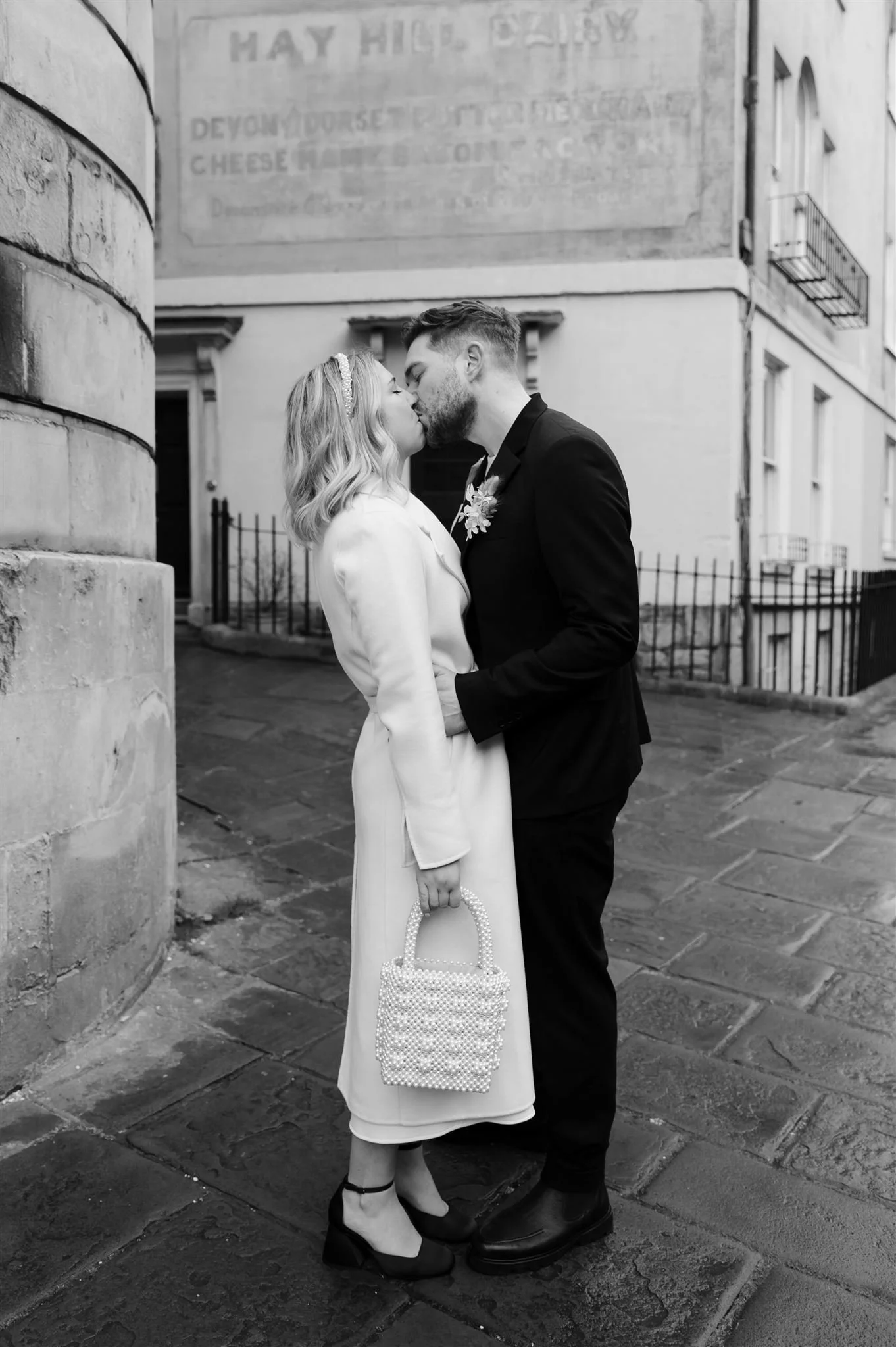 Photographing an Elopement day in Bath is honestly so lovely, as every single street we walked down to take wedding photos there was some sort of beautiful historic significance. We strolled by the historic Bath Assembly Rooms, which is now a part of the national trust and have local exhibitions as well. We then strolled in the rain under umbrellas, which is always a romantic situation on a wedding day and some even say it’s “good Luck”, and walked all of the way to Hay Hill street in bath, which is home to the historic Hay Hill Dairy. The cobble stoned street is so lovely for wedding photography or any couple portraits in the center of bath.